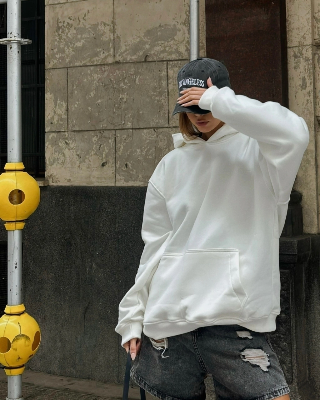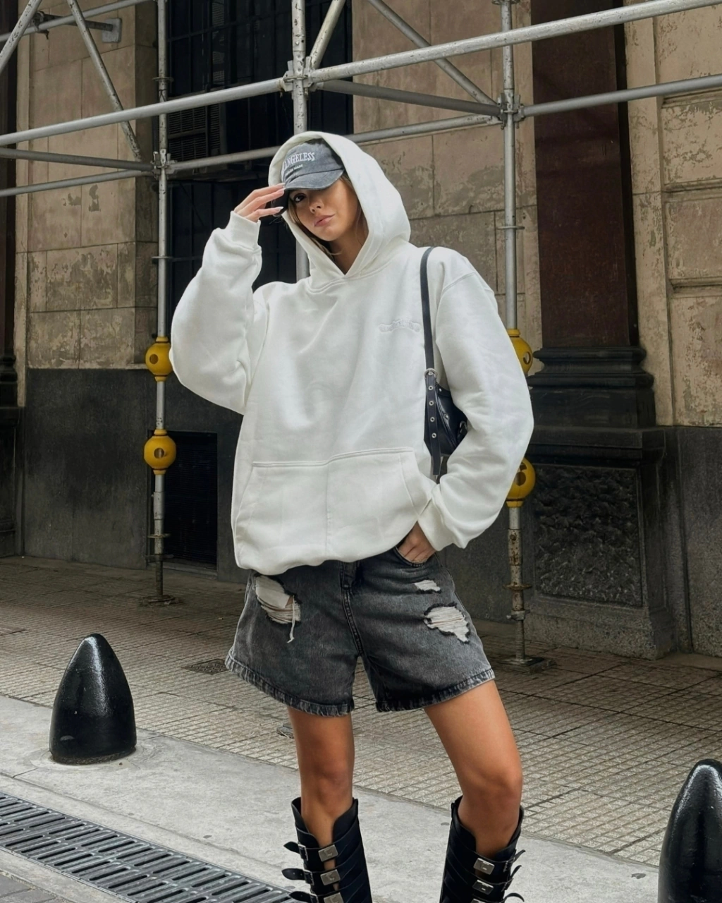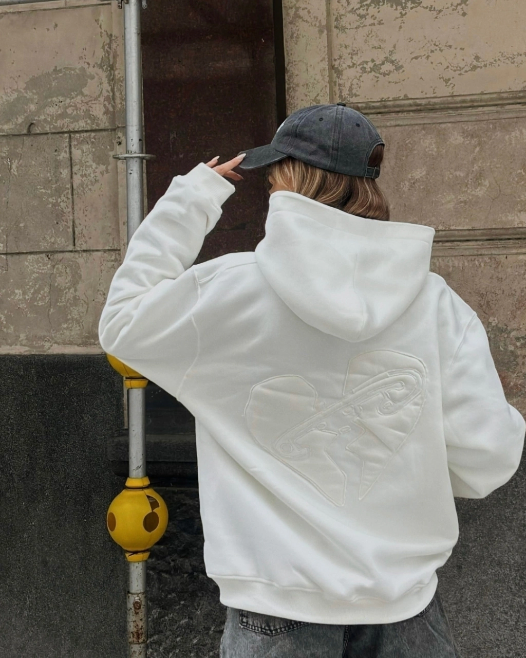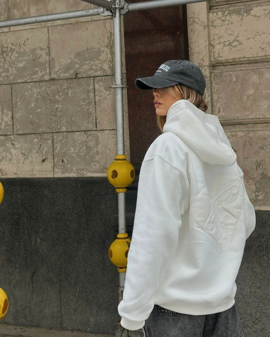 Buzo Off White con tela de frisa pesada 100% algodón. Contiene un aplique de tela bordada sobre la espalda, el logo bordado en la parte de adelante y la capucha forrada.